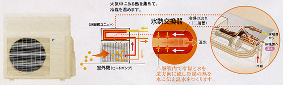 その秘密は大気の熱を汲み上げ、その熱を利用して温水をつくるエアコンでおなじみの